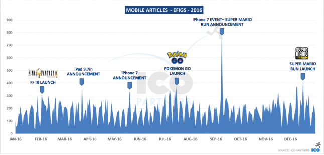 The year covered in the report most notably includes both the launch of Pokemon Go and Mario’s debut on mobile devices through Super Mario Run but curiously, outside of a blip caused by Super Mario Run’s announcement, the number of articles covering mobile games in 2016 remained fairly consistent.
